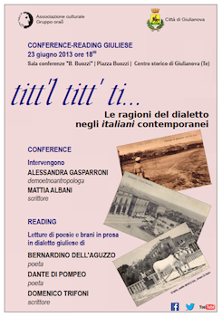 GIULIANOVA (TE) – Domenica 23 giugno, alle ore 18, presso la Sala Buozzi nel centro storico di Giulianova, si terrà una “Conference-Reading in dialetto giuliese” sulla funzione antropologica e linguistica dei dialetti. Dal titolo “Titt’l titt’ ti” – Le ragioni del dialetto negli italiani contemporanei, l’incontro è organizzato dall’Associazione culturale giuliese Gruppo Oraõ che ha sottolineato come: