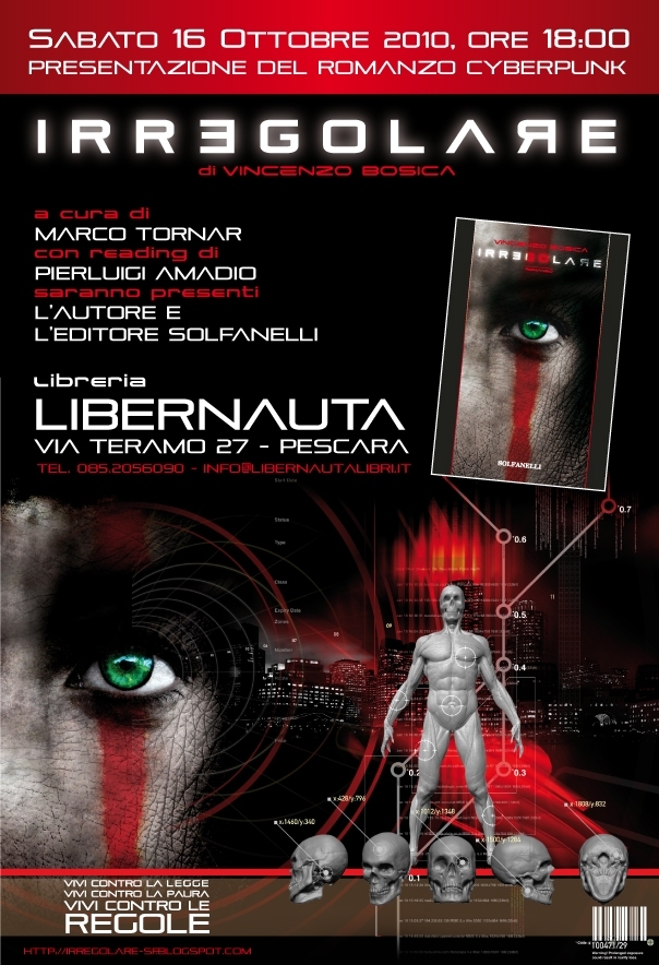 IRREGOLARE, il romanzo – ’Irregolare’’ e’ un romanzo cyberpunk la cui trama, cupa e adrenalinica, si svolge in un mondo iper-tecnologico, una societa’ ormai disumanizzata dalle macchine, in cui la vita media ha superato il secolo grazie agli impianti cibernetici sostitutivi e potenziati e dove il collasso demografico e’ scongiurato con l’introduzione di una direttiva internazionale, che dispensa un Permesso di Procreazione solo in caso di un nuovo decesso. Identita’ personali registrate e codificate digitalmente creano una traccia informatica unica e indelebile e nessuno puo’ sfuggire al sistema elettronico. Ma ecco che un omicidio scuote Shaun Morrison, detective poco incline alla disciplina imposta dal corpo di polizia, che indaghera’ sul caso con tutti i mezzi tecnologici a disposizione fino a trovarsi davanti a qualcuno che va oltre la Legge, oltre la normalità, oltre le regole: un irregolare. ‘’Irregolare’’ (Edizioni Solfanelli, 2010 – pag 272, € 16,00) e’ nato dalla creativita’ di Vincenzo Bosica, giovane scrittore pescarese, gia’ applaudito dal pubblico e dalla critica con il racconto ‘’Capsule’’ (“IF-Insolito e Fantastico”, n. 2/2009), saggio sulla scienza moderna.
