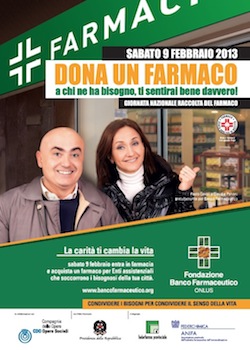 Sabato, 9 febbraio prossimo, l’edizione 2013 dell’iniziativa. In numerose farmacie della regione i volontari inviteranno i clienti a donare farmaci da banco che saranno consegnati a persone bisognose