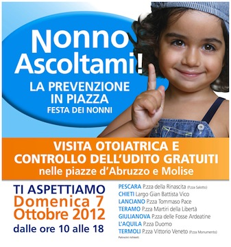 Domani per l’intera giornata (dalle 10 alle 18), tutti i nonni potranno effettuare controlli gratuiti dell’udito e una visita otoiatrica. Come? Semplice. Recandosi nelle principali piazze di Abruzzo e Molise, presso strutture comunali o all’interno delle strutture mobili messe a disposizione dalla Misericordia o dalla Croce Rossa Italiana.Quest’anno, inoltre, l’iniziativa si amplia e vede coinvolti il Presidio Ospedaliero di Pescara, di Chieti, di Lanciano, dell’Aquila, di Giulianova, di Termoli e per la prima volata anche di Teramo.
