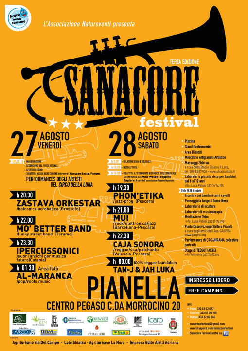 PIANELLA (PE) – Dopo il successo della passata edizione ritorna il festival Sanacore a Pianella (Pe) organizzato dall’Associazione Natureventi, nelle giornate di venderì e sabato 27 e 28 agosto 2010. Due giorni di concerto a ingresso libero per un interessante evento di fine estate.