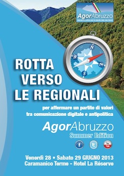 «Siamo ormai alla vigilia del rinnovo del Consiglio regionale in Abruzzo e vogliamo arrivare all’appuntamento pronti e consapevoli di aver fatto la nostra parte con impegno, seppure in un momento storico difficilissimo – ha commentato il direttore politico di AgorAbruzzo, Nazario Pagano, nel presentare l’edizione 2013 del simposio politico – Ci confronteremo con il Ministro Quagliariello che ci illustrerà quanto questo Governo di larghe intese sta facendo o ha in programma di fare. Ma ci confronteremo anche e soprattutto con il Presidente della giunta, Gianni Chiodi, e con alcuni dei suoi assessori sui temi di grande attualità che la Regione Abruzzo sta affrontando, a cominciare da un problema vitale: l’occupazione giovanile. Ma ci occuperemo anche di web communication e di quanto sia ormai indispensabile per la politica di oggi dialogare con i cittadini attraverso le nuove tecnologie. Concluderemo il nostro simposio con una tavola rotonda su un tema essenziale per le prossime regionali: il futuro dei moderati in Abruzzo con gli alleati naturali del Popolo della Libertà»