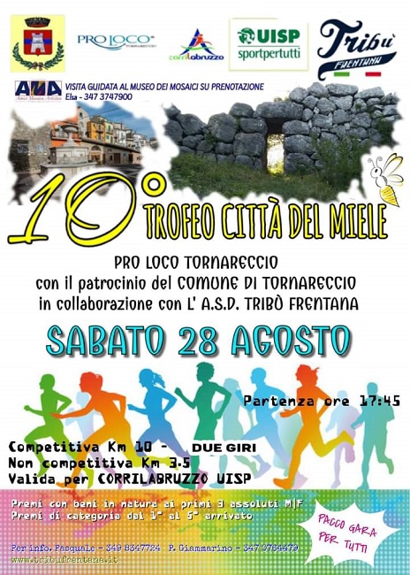 La decima edizione del Trofeo Città del Miele di sabato 28 agosto è un’occasione di grande spettacolo sportivo da non perdere per la vasta community dei podisti e di fuori regione in cui la Tribù Frentana può presentare i frutti di tutto l’impegno organizzativo.