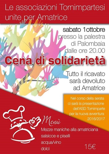 TORNIMPARTE (AQ) – In seguito al tragico terremoto che ha colpito il centro Italia il 24 agosto scorso, tutte le associazioni di Tornimparte in collaborazione con il Comune organizzano una serata di beneficenza per raccogliere fondi che saranno destinati alle popolazioni colpite dal sisma.