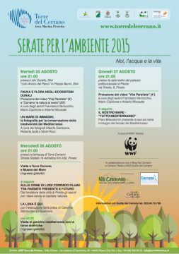 PINETO (TE) – L’AMP Torre del Cerrano in collaborazione con il WWF Teramo organizza tre serate per l’ambiente nella cornice del parco marino. Il tema delle serate è l’acqua e l’importanza che essa riveste nella nostra esistenza e in quella degli altri esseri viventi, fondamentali nell’ecosistema mondiale.