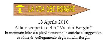 TORRICELLA SICURA (TE) – Nell’ambito del progetto “Primavera in bici – Torricella Sicura 2010” , si terrà un duplice appuntamento : convegno e biciclettata (o passeggiata a piedi), che si prefigge come obiettivi la cura della salute , ma anche la riscoperta e salvaguardia del territorio. Nella Conferenza del 17 aprile, sabato, si parlerà dei benefici apportati dalla pratica sportiva, ma anche di come riscoprire il territorio, la sua storia e la sua cultura. Domenica,18 aprile, a Torricella si parte alla riscoperta della “Via de Borghi”, in mountain bike o a piedi attraverso le antiche e suggestive stradine di collegamento di sette antichi Borghi in otto km.