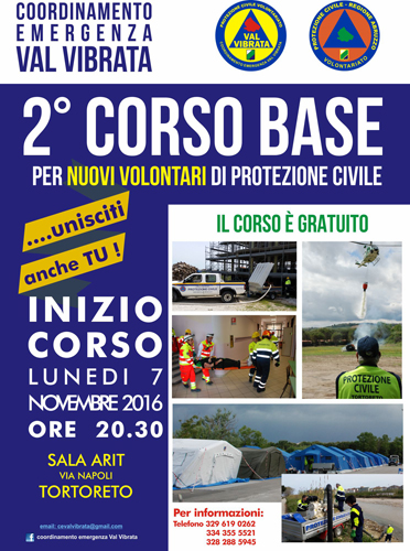 TORTORETO (TE) – Fino alle ore 20 di giovedi 7 novembre sono aperte le iscrizioni al corso base per diventare volontari della Protezione Civile, organizzato dal Coordinamento Emergenza Val Vibrata in collborazione con le associazioni di, Sant’Omero, Tortoreto, Alba Adriatica, Torano Nuovo, Nereto, GRE, e Avio Club di Corropoli.