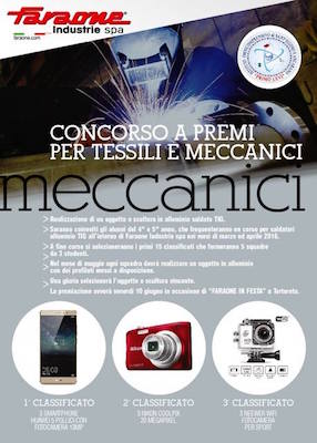 Il primo, destinato alla sezione meccanica, prevede la realizzazione di un oggetto o scultura in alluminio TIG. Saranno coinvolti gli alunni del 4° e 5° anno, che frequenteranno un corso per saldatori alluminio TIG all’interno di Faraone Industrie spa nei mesi di marzo ed aprilo 2016. A fine corso si selezioneranno i primi 15 classificati che formeranno 5 squadre da 3 studenti. Nel mese di maggio ogni squadra dovrà realizzare un oggetto in alluminio con dei profilati messi a disposizione. Una giuria selezionerà l’oggetto o scultura vincente. La premiazione avverrà venerdì 10 giugno in occasione di “FARAONE IN FESTA” a Tortoreto.