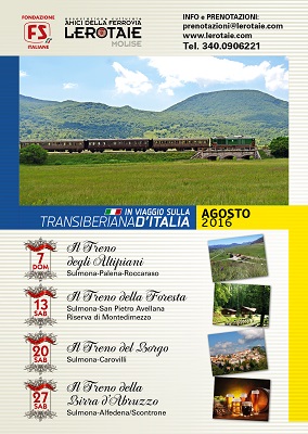 Per questa estate sono 5 gli appuntamenti in calendario: si comincerà con un evento d’eccezione il 31 luglio, quando il treno storico da Isernia raggiungerà Sulmona per l’attesa Giostra Cavalleresca (posti già tutti sold out), per proseguire con due date all’insegna della natura e delle escursioni a piedi, in bici o a cavallo, partendo da Sulmona con meta domenica 7 agosto gli Altipiani Maggiori d’Abruzzo al confine con il Parco Nazionale della Majella, con ritorno nel pomeriggio per partecipare all’attesa Giostra Cavalleresca d’Europa in una Sulmona vestita a festa, e sabato 13 agosto la riserva di Montedimezzo, tutelata dal 2014 dall’UNESCO per il suo inestimabile patrimonio forestale e faunistico.