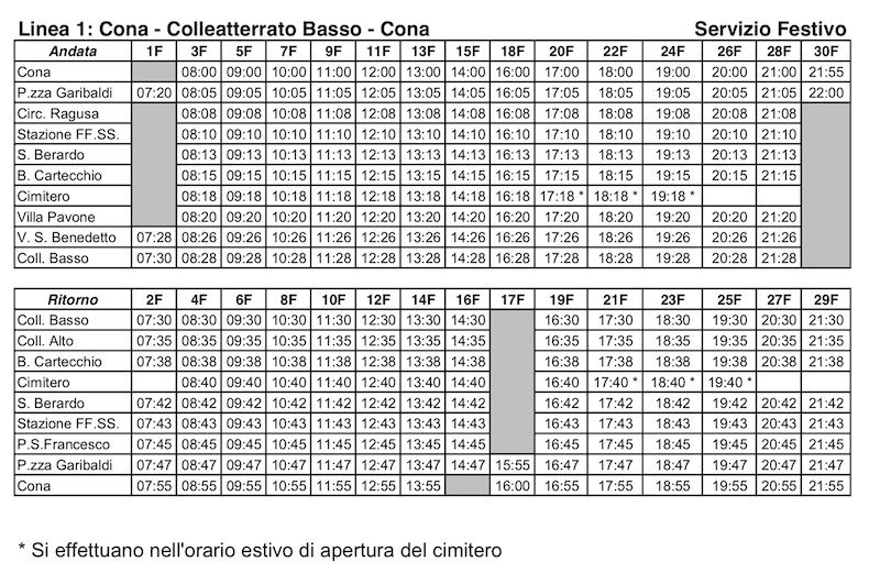 Per ciò che concerne la linea 1, viene stabilito di servire il Cimitero Urbano nei giorni festivi mediante prolungamento del percorso sul tracciato di via Luigi Maria Pirelli e di via del Cimitero, con riscorso alla rotonda ipogea di viale Europa durante l’orario di apertura del Cimitero Urbano.
