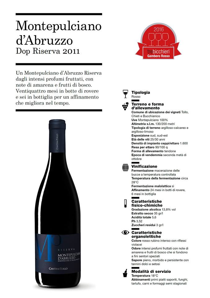 Dopo il bis del C’Incanta Trebbiano d’Abruzzo Dop (Tre Bicchieri 2014 e 2015) e il Tre Bicchieri 2013 assegnato al Cagiòlo Montepulciano d’Abruzzo Dop Riserva, è la volta del Montepulciano d’Abruzzo Dop Riserva 2011, un vino dagli intensi profum