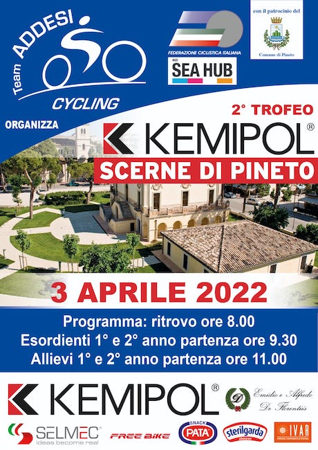 Collocandosi prima del Trofeo GLS-GS allievi a cura del Team Go Fast, il Trofeo Kemipol è un appuntamento al quale tanti esordienti non vogliono mancare per dare il meglio di loro stessi, per divertirsi ed inseguire i sogni, come è nello spirito delle manifestazioni organizzate da Pierpaolo Addesi con la sua Addesi Cycling che si avvale del main sponsor Kemipol e degli altri partner Emidio ed Alfredo De Florentiis, Kemipol, Kemiclean, Snack Pata, Ivar, Freebike, Selmec e Sterilgarda, più la collaborazione sinergica con le società ciclistiche Sea Hub e Team Go Fast.