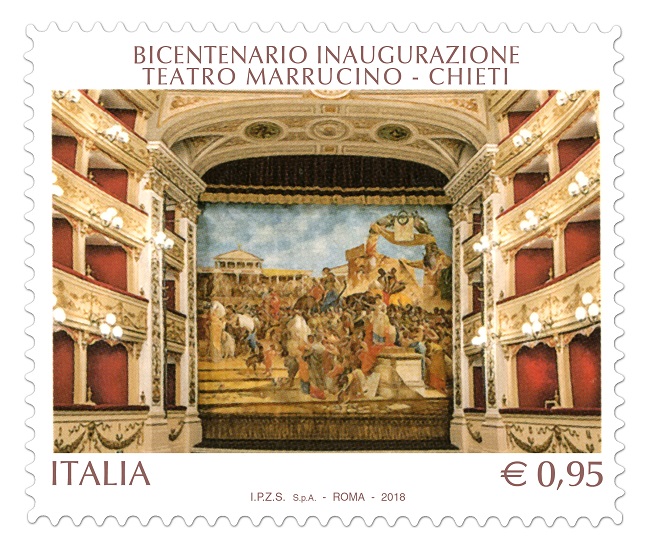 Completano il francobollo la leggenda “Bicentenario inaugurazione Teatro Marrucino Chieti”, la scritta “Italia” e il valore “€ 0,95”.