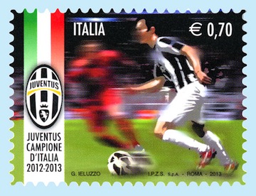 ROMA – Sabato 18 ottobre, sarà disponibile presso tutti gli uffici postali abruzzesi un francobollo speciale dedicato alla Juventus, squadra vincitrice del Campionato italiano di Calcio serie A 2012-2013. Lo ha comunicato Poste Italiane vista l’autorizzazione del Ministero dello Sviluppo Economico. Il francobollo ordinario dal valore di € 0,70 appartiene alla serie tematica “lo Sport italiano” mentre la vignetta è stata realizzata dal bozzettista Gaetano Ieluzzo che ha valuto raffigurare in primo piano un calciatore con la classica divisa bianconera durante un’azione di gioco; a sinistra, entro una banda tricolore, è riprodotto lo stemma della Juventus.