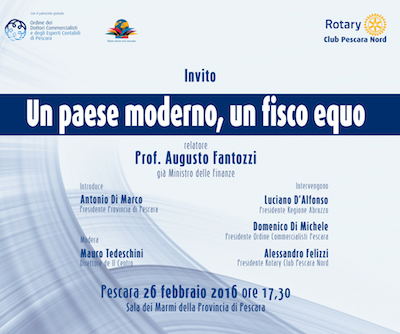 Ospite relatore sarà il Prof. Augusto Fantozzi, ordinario di diritto tributario, avvocato tributarista e più volte Ministro della Repubblica, a cui seguiranno gli interventi ed i saluti di prestigiosi ospiti: il Presidente della Regione Abruzzo Luciano D’Alfonso, il Presidente della Provincia di Pescara Antonio Di Marco, il Presidente dell’Ordine dei Commercialisti di Pescara Domenico Di Michele ed il Presidente del Rotary Club Pescara Nord Alessandro Felizzi. Modererà l’incontro il Direttore del quotidiano Il Centro Mauro Tedeschini. L’evento è aperto al pubblico.