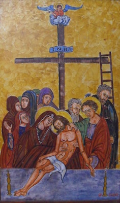 La cerimonia di domenica prossima prevede il saluto di don Dionisio Rodriguez, e la benedizione dell’icona, poi gli interventi di Ugo de Paulis (L’amicizia di Constantin Udroiu per Paganica), Goffredo Palmerini (Constantin Udroiu, un grande artista. Vita e opere) e Luisa Valmarin (Le icone di Constantin Udroiu: suggestioni di un’arte singolare). Dopo di che l’icona verrà collocata e permanentemente esposta nella Sala conferenze del Centro Pastorale. Nel medesimo auditorium saranno anche sistemati due affreschi – una Deposizione dalla Croce e una Resurrezione – realizzati nel 1988 da Constantin Udroiu per una famiglia paganichese e da questa donati l’8 gennaio 2000 alla Parrocchia “in memoria di Lina, Vinicio ed Enzo”.