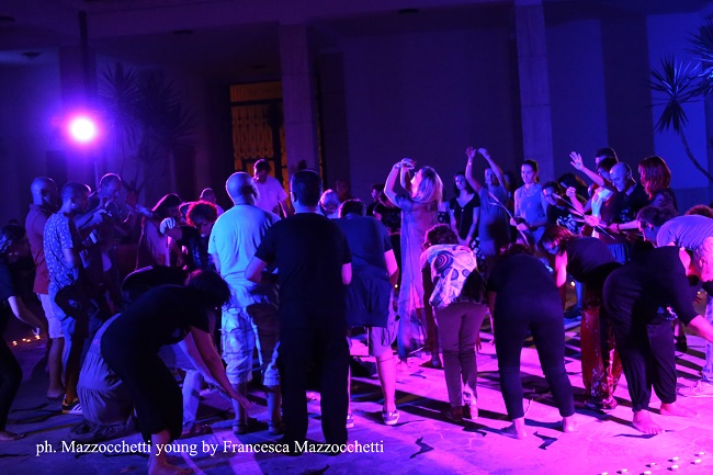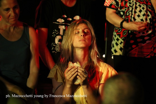 Ad aprire la serata, B.EX 5 a cura di Daniele Ciavattella, il pubblico bendato, dopo aver raggiunto il fiume Giordano, si è ritrovato a sperimentare l’incontro sensoriale con la Trinità cristiana: Padre Figlio e Spirito Santo, il Dio della prossimità che cerca un contatto con tutti i presenti. Sulla scena migliaia di piccoli lapilli di carta bianca a costruire il liberante impatto col battesimo.