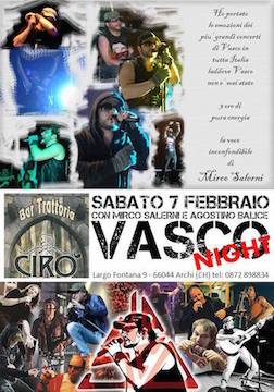 ARCHI (CH) – Sabato prossimo 7 febbraio dalle 22.30, presso il Bar Trattoria “Cirò” (largo Fontana, 9) ad Archi, ci sarà una serata dedicata a Vasco Rossi dal titolo “Vasco Night”. Saranno ripercorsi i più grandi successi del Blasco nazionale attraverso la voce di Salerni, accompagnato dalle note di Agostino Balice. Tre ore di piena adrenalina all’insegna del rock autentico in un percorso tra le emozioni dei suoi più grandi concerti che hanno fatto la storia della musica italiana.