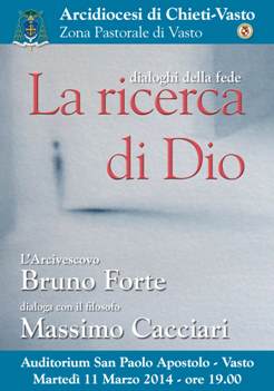 VASTO (CH) – Martedì 11 Marzo 2014, presso l’Auditorium San Paolo Apostolo a Vasto, alle ore 19.00, nell’ambito del programma culturale e religioso “I dialoghi della fede”, promosso dall’Arcidiocesi di Chieti-Vasto, l’Arcivescovo e teologo Bruno Forte dialogherà con il filosofo Massimo Cacciari sul tema “La ricerca di Dio”.Lo rende noto Don Gianni Sciorra, Vicario della Zona Pastorale di Vasto