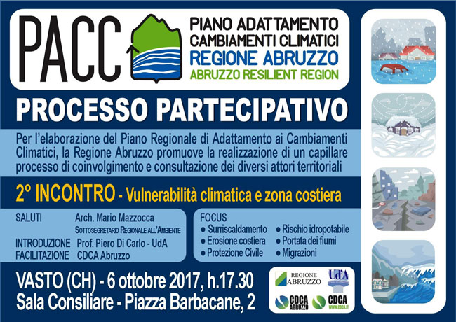 VASTO (CH) – Il secondo incontro pubblico del percorso partecipativo volto alla definizione del Piano di Adattamento ai Cambiamenti Climatici (PACC) della Regione Abruzzo si terrà venerdì 6 ottobre alle ore 17.30 presso la Sala Consiliare del Comune di Vasto, in P.zza Barbacane n. 2.