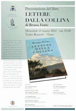 VASTO (CH) – Mercoledì 11 marzo 2015, presso il Teatro Rossetti di Vasto, alle ore 19.00, ci sarà la presentazione del libro “Lettere dalla collina” di S. E. Mons. Bruno Forte, Arcivescovo di Chieti-Vasto.Alla presenza dell’Autore interverranno il Prof. Michele Cascavilla, Docente di Filosofia del Diritto, l’Avv. Raffaella Valori, Presidente dei Giuristi Cattolici di Vasto, Don Domenico Spagnoli, Responsabile della Pastorale Vocazionale Diocesana, Don Nicola Florio, Responsabile della Pastorale Giovanile Diocesana e Don Gianni Sciorra, Vicario della Zona Pastorale di Vasto, nel ruolo di moderatore dell’incontro.