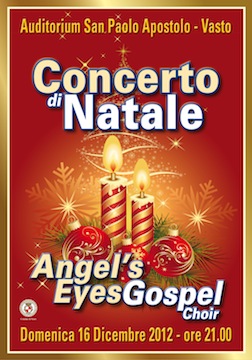 VASTO (CH) – Domenica 16 Dicembre prossimo, presso l’Auditorium San Paolo Apostolo a Vasto, alle ore 21.00, ci sarà il tradizionale Concerto di Natale del Gospel Choir Angel’s Eyes della Parrocchia San Paolo Apostolo. Si tratta della V edizione di un appuntamento iniziato nel dicembre 2008.Lo rende noto Don Gianni Sciorra, Parroco della Parrocchia San Paolo Apostolo in Vasto.