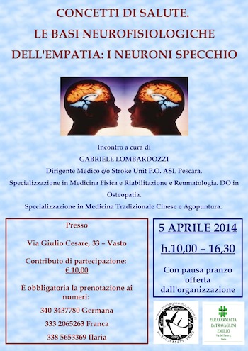 VASTO (CH) – Sabato, 5 Aprile 2014, a Vasto in via Giulio Cesare 33 dalle ore 10.00 alle ore 16.30, si terrà un incontro a cura di Gabriele Lombardozzi, dirigente medico della stroke unit PO ASL Pescara , specialista in Medicina Fisica, Riabilitazione e Reumatologia, DO in osteopatia, Specializzato in Medicina Tradizionale Cinese e Agopuntura. Il relatore spiegherà il ruolo dei Neuroni Specchio nell’ambito della comunicazione, imitazione e apprendimento e nella comprensione/identificazione con l’altro, cioè le basi neurofisiologiche dell’empatia.