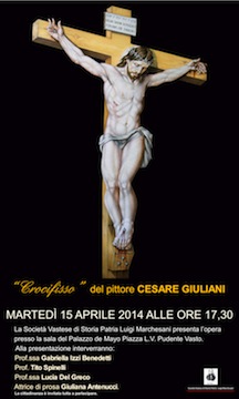 VASTO (CH) – La Società Vastese di Storia Patria Luigi Marchesani presenta oggi,martedì 15 Aprile 2014 alle ore 17.30 l’opera ” Crocifissione ” del Maestro Cesare Giuliani presso la sala del Palazzo de Mayo Piazza L.V. Pudente Vasto.