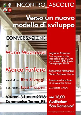 CARAMANICO TERME (PE) – Venerdi 8 luglio alle ore 18, presso l’Auditorium San Domenico di Caramanico Terme (Pe), si terrà l’incontro ascolto “Verso un Nuovo Modello di Sviluppo” organizzato da Sel/SI Abruzzo.