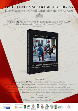 PESCARA – Venerdì 14 novembre, alle ore 17, presso la Sala “Domenico Tinozzi” della Provincia di Pescara ci sarà la presentazione del libro “Vestiti della nostra militar divisa. L’insediamento dei Reali Carabinieri nei Tre Abruzzi”, edito dalla casa editrice Menabò in occasione del bicentenario dell’Arma dei Carabinieri (1814 – 2014) e scritto dal Maggiore dei Carabinieri Alessandro Mennilli, in servizio presso il Comando della Legione “Abruzzo” di Chieti e da Annalisa Massimi, archivista. L’incontro sarà presentato e moderato da Andrea Taffi, Capo Redazione Abruzzo del quotidiano “Il Messaggero”.