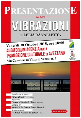 AVEZZANO (AQ) – Venerdì 30 ottobre, alle ore 18, sarà presentato il libro “Vibrazioni” di LELIA RANALLETTA ad Avezzano, presso l’Auditorium dell’Agenzia di Promozione Culturale.