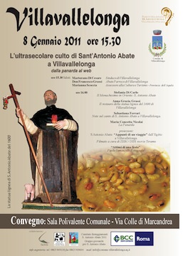 VILLAVALLELONGA (AQ) – Si terrà presso la Sala Polivalente Comunale di Villavallelonga, sabato 8 gennaio 2011, a partire dalle 15.30 il Convegno“L’ultrasecolare culto di S. Antonio Abate a Villavallelonga – dalla Panarda al Web”. Organizzato dal Comune di Villavallelonga (AQ) e dalla Parrocchia SS. Leucio e Nicola, con la collaborazione di alcune Associazioni locali,precede i festeggiamenti annuali in onore del Santo.