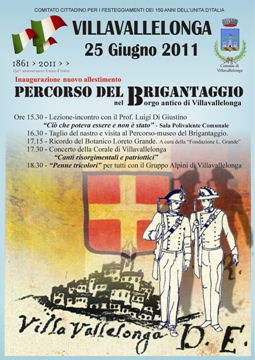 VILLAVALLELONGA (AQ) -Verrà inaugurato a Villavallelonga sabato 25 giugno 2011 il nuovo allestimento dello spazio espositivo all’aperto dedicato al brigantaggio.Il Comune e il Comitato Cittadino organizzano un pomeriggio dedicato all’evento, che rientra nell’ambito delle celebrazioni per i 150 anni dell’Unità d’Italia.