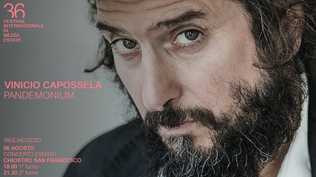 TAGLIACOZZO (AQ) – Narrazione, piano, voce e strumenti pandemoniali. Uno spettacolo straordinario Giovedì 6 Agosto con doppio turno alle 18.30 e alle 21.30 per il grande compositore e cantante italiano Vinicio Capossela, visionario artista dalla fama internazionale. Il Chiostro di San Francesco sarà quindi cornice suggestiva di uno spettacolo che ha già conquistato tutto il territorio italiano.