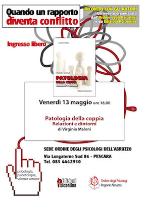 PESCARA – Venerdì 13 maggio alle ore 18.00 Virginia Maloni presenta Patologia della coppia. Relazioni e dintorni presso la sede di Pescara dell’Ordine degli Psicologi dell’Abruzzo, in Via Lungaterno Sud, 86.