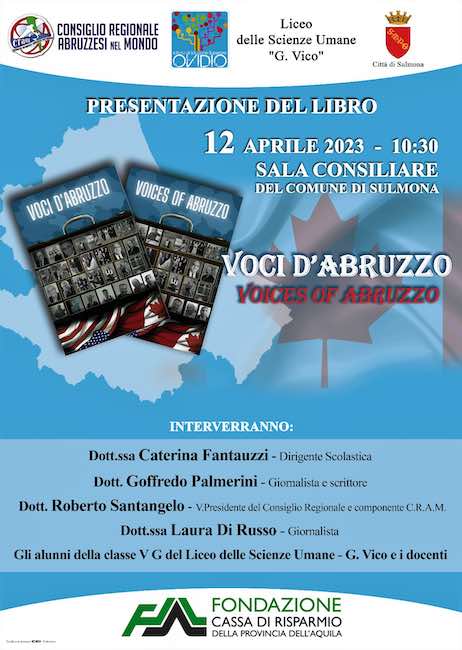 Di quest’altro Abruzzo, attraverso il racconto di storie vissute, parla anche VOCI D’ABRUZZO, il nuovo libro che gli studenti del Liceo Giambattista Vico di Sulmona, coordinati dalle loro insegnanti Carolina Lettieri, Anna Lucia Cardinali e Vanessa Romanelli, dopo le belle pubblicazioni realizzate negli anni scorsi (La Merica e Un oceano di carta), finalmente portano alla luce grazie alla lungimiranza della dirigente scolastica Caterina Fantauzzi, assai sensibile verso lo studio del fenomeno migratorio italiano. Sono vite di Abruzzesi, in gran parte originari del territorio peligno, che in Canada e negli Stati Uniti hanno messo in mostra il loro talento, la loro creatività, la ricchezza del loro patrimonio culturale, affermandosi in molteplici campi di attività e contribuendo così a rendere onore alla loro terra d’origine e alla loro Patria, l’Italia, dando esempio e testimonianza di serietà, laboriosità e ingegno.