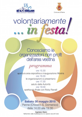 PENNE (PE) – Sarà una grande festa del volontariato dell’area vestina, quella che si terrà a Penne, sabato 30 maggio nel chiostro di San Domenico a partire dalle ore 15.30. “Volontariamente… in festa!” è l’iniziativa organizzata dal Centro servizi per il volontariato di Pescara, in collaborazione con il Comune di Penne, con l’obiettivo di avvicinare la cittadinanza al mondo della solidarietà, diffondendo la cultura del volontariato e promuovendo la conoscenza delle organizzazioni non profit, operanti sul territorio vestino.