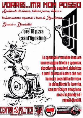 “A Teramo il 23 Aprile 2016 dalle ore 16 a Piazza S. Agostino ci sarà una iniziativa organizzata dalle seguenti associazioni: Centro Politico Sandro Santacroce, Polisportiva Gagaria, Azione Antifascista Teramo, Associazione Carrozzine Determinate Abruzzo. Questa iniziativa “vorrei…ma non posso” sarà uno spettacolo di danza, lettura poesie e testimonianza per inviare un messaggio di lotta e speranza, descrivendo emozioni, debolezza e punti di forza di coloro che non hanno l’opportunità di vivere in piena libertà la propria vita.