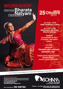 PESCARA – Sabato prossimo, 25 ottobre, presso il centro yoga SOHAM di Pescara si terrà il Workshop di danza e cultura indiana con Lucrezia Maniscotti; attrice, insegnante, danzatrice, laureata in Lettere Moderne (Indologia/Storia del Teatro).