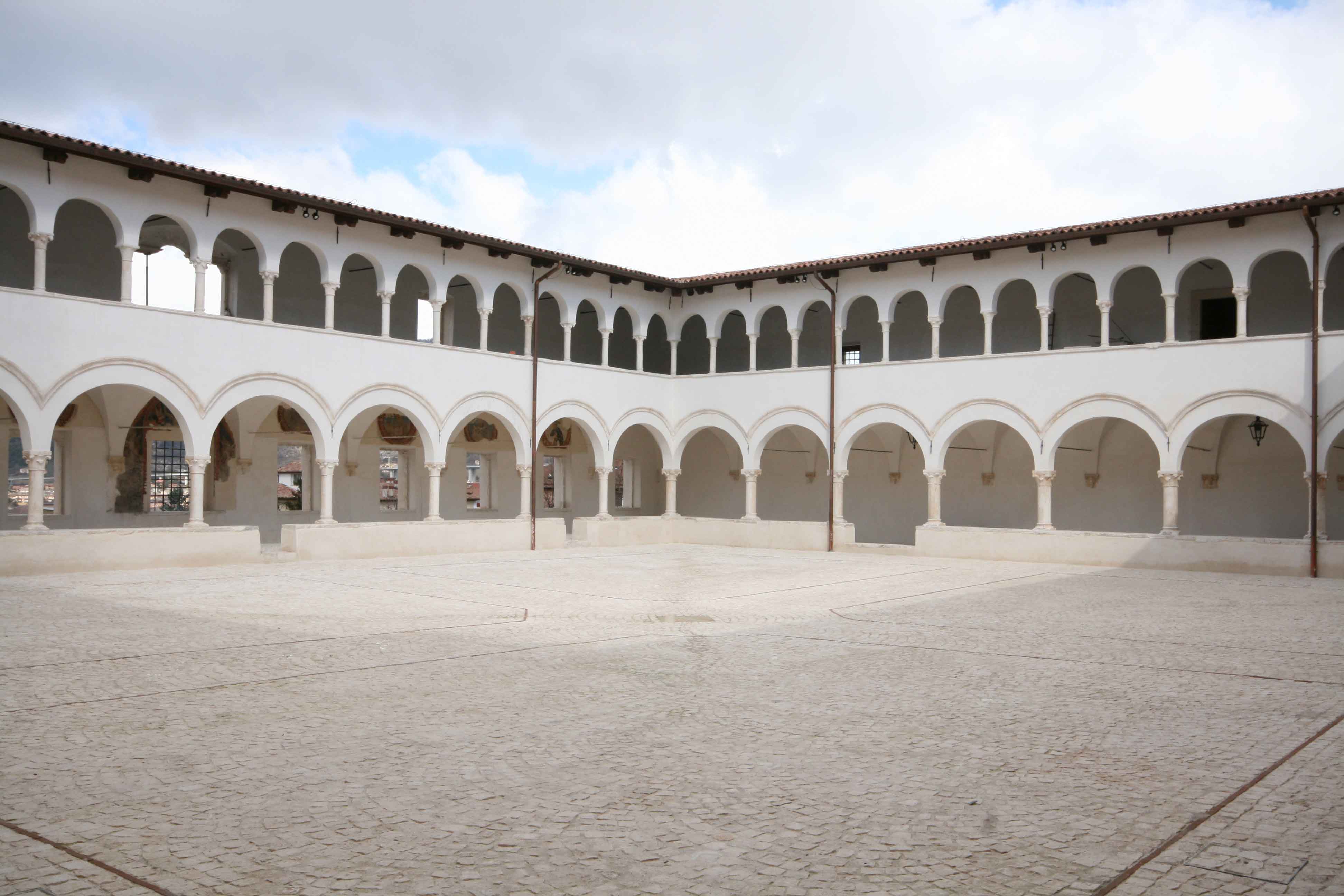 Il chiostro infatti, è il ripristino di quello che fu ricostruito dopo il sisma del 1461, sulle macerie di un preesistente chiostro costruito nel Trecento accanto al complesso monastico di S. Domenico di epoca angioina, quindi poco dopo la fondazione della città, avvenuta nel 1254. Il chiostro come era stato riedificato alla fine del Quattrocento resistette bene al sisma del 1703, ma chiuso il convento per l’editto murattiano, venne trasformato successivamente, dall’inizio del 1800 e fino al 1994, in carcere. Anche nel chiostro e nel porticato vennero costruite celle penitenziarie, per cui tutta la struttura ne fu completamente stravolta.