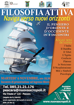 Per avvicinare giovani e meno giovani alla naturale tendenza di ognuno di essere Filosofi, Martedì 6 novembre, alle ore 18.30, presso la sede di Pescara, in via Trieste n° 125 (angolo con via Nicola Fabrizi), si terrà dunque una nuova presentazione del Corso di Filosofia Attiva “Naviga verso nuovi orizzonti”: un appuntamento ad ingresso libero e non impegnativo, nel quale verranno illustrate le finalità, il programma e le modalità di svolgimento del ciclo di incontri.