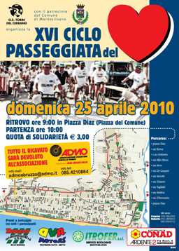 MONTESILVANO (PE) – Domenica 25 aprile a Montesilvano in Piazza Diaz (Piazza del Comune, ADMO Abruzzo Onlus, il G.S. TORRE DEL CERRANO di Montesilvano, con il patrocinio del Comune di Montesilvano, organizzano la “XVI Ciclo Passeggiata del Cuore”.